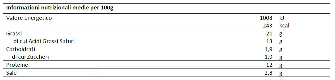 Ingredienti: formaggi 49%: Italico 40%, emmenthal 27%, fontina 20%, grana padano (lisozima da uova) 13%; acqua, burro, siero di latte, sali di fusione: citrato di sodio (E331), polifosfati (E450); fibra vegetale, conservanti: acido sorbico (E200), nisina (E234).