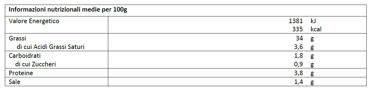 Ingredienti: cime di rapa 60%, olio di semi di girasole, proteine vegetali, sale, peperoncino, aroma naturale di aglio, aroma naturale, correttori di acidità: acido citrico (E330), acido lattico (E270).