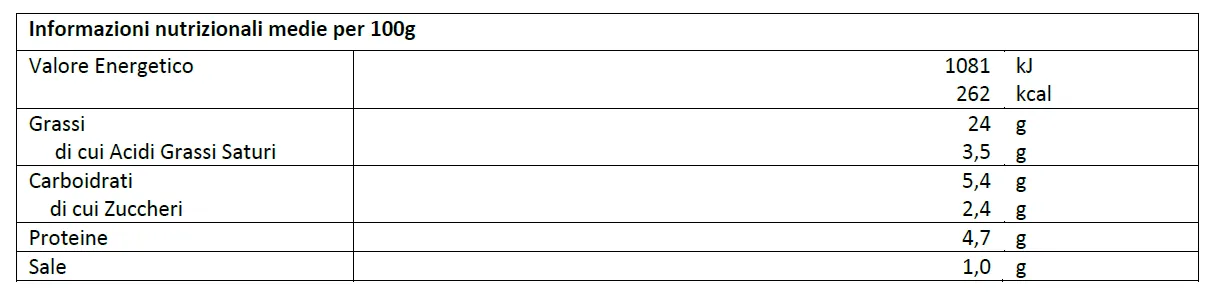 Ingredienti: funghi champignons (Agaricus bisporus) 80%, olio di semi di girasole, olio d’oliva, tartufi 4%: tartufo scorzone (Tuber aestivum Vitt.), tartufo bianchetto (Tuber borchii Vitt.); cipolla, fecola di patate, burro, proteine del latte, amido di mais, fibra vegetale, sale, spezie, estratto di lievito, aromi, antiossidante: acido ascorbico (E300)