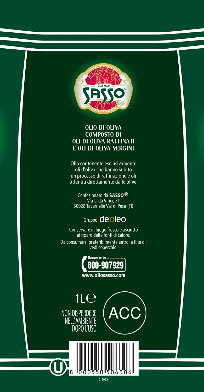 L’Olio di Oliva Sasso, prodotto per chi ama un’alimentazione equilibrata, è un prezioso alleato in cucina. Colore giallo dorato e aspetto limpido e brillante, è un olio di qualità che si accompagna ad ogni piatto con la leggerezza e la delicatezza di sempre. Per preservare al meglio le caratteristiche organolettiche nel tempo, l’olio è confezionato nella tradizionale latta verde.