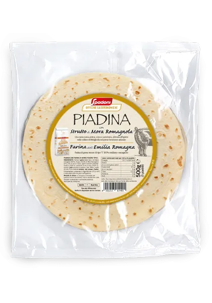 La Piadina delle Officine Gastronomiche Spadoni è realizzata con Farina di grano tenero di tipo “1”, 100% Emiliano-Romagnolo e con Strutto di Mora Romagnola, che dona un sapore unico e autentico al prodotto.